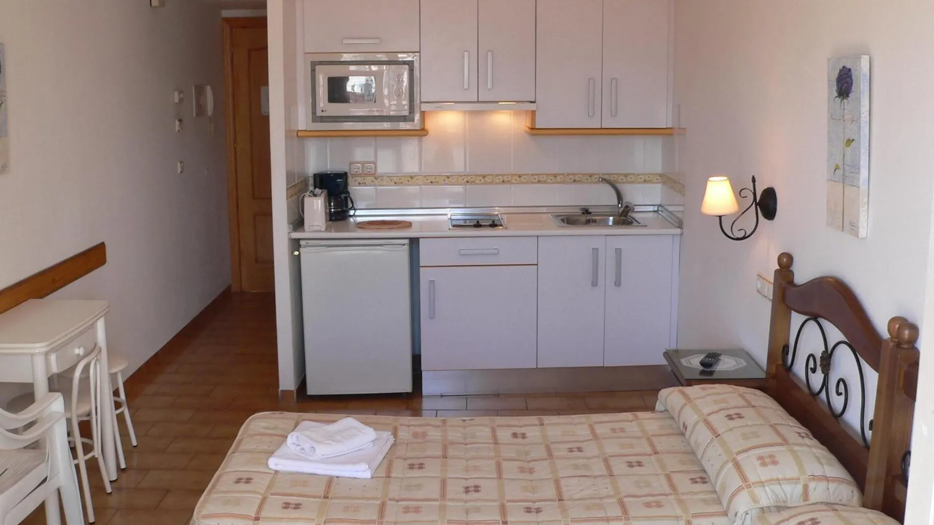 Los apartamentos disponen de una pequeña cocina con hervidor eléctrico, nevera y menaje de cocina.